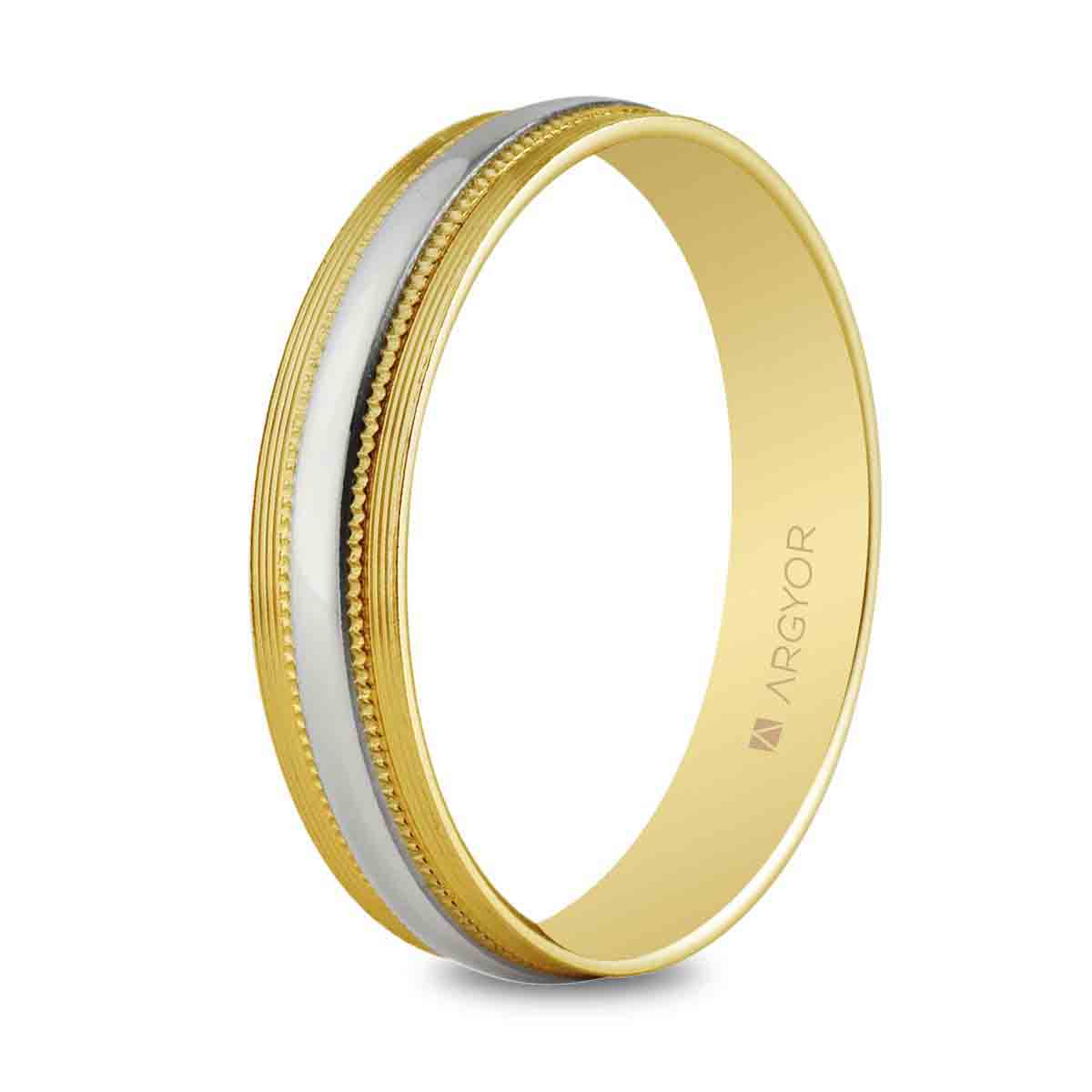 Alianza de boda de diseño Argyor 2oros de 18K referencia 5240101 de 4 mm de ancho. Esta joya tiene un acabado facetado brillante y un interior plano.