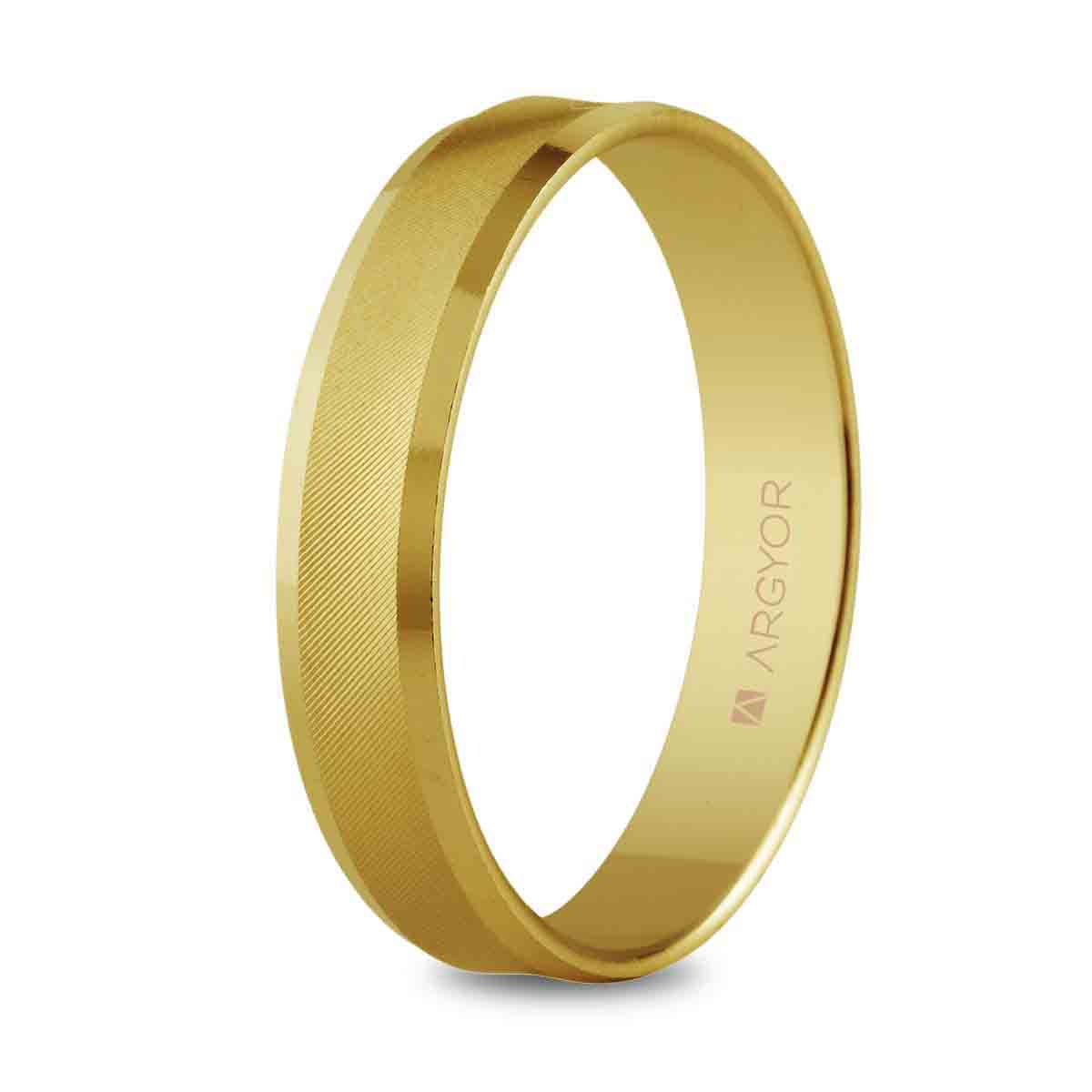 Alianza de boda de oro amarillo de de 18 quilates. Banda central con sección cóncava y acabado matizado suave, y cantos pulidos. Anchura de 4 milímetros.