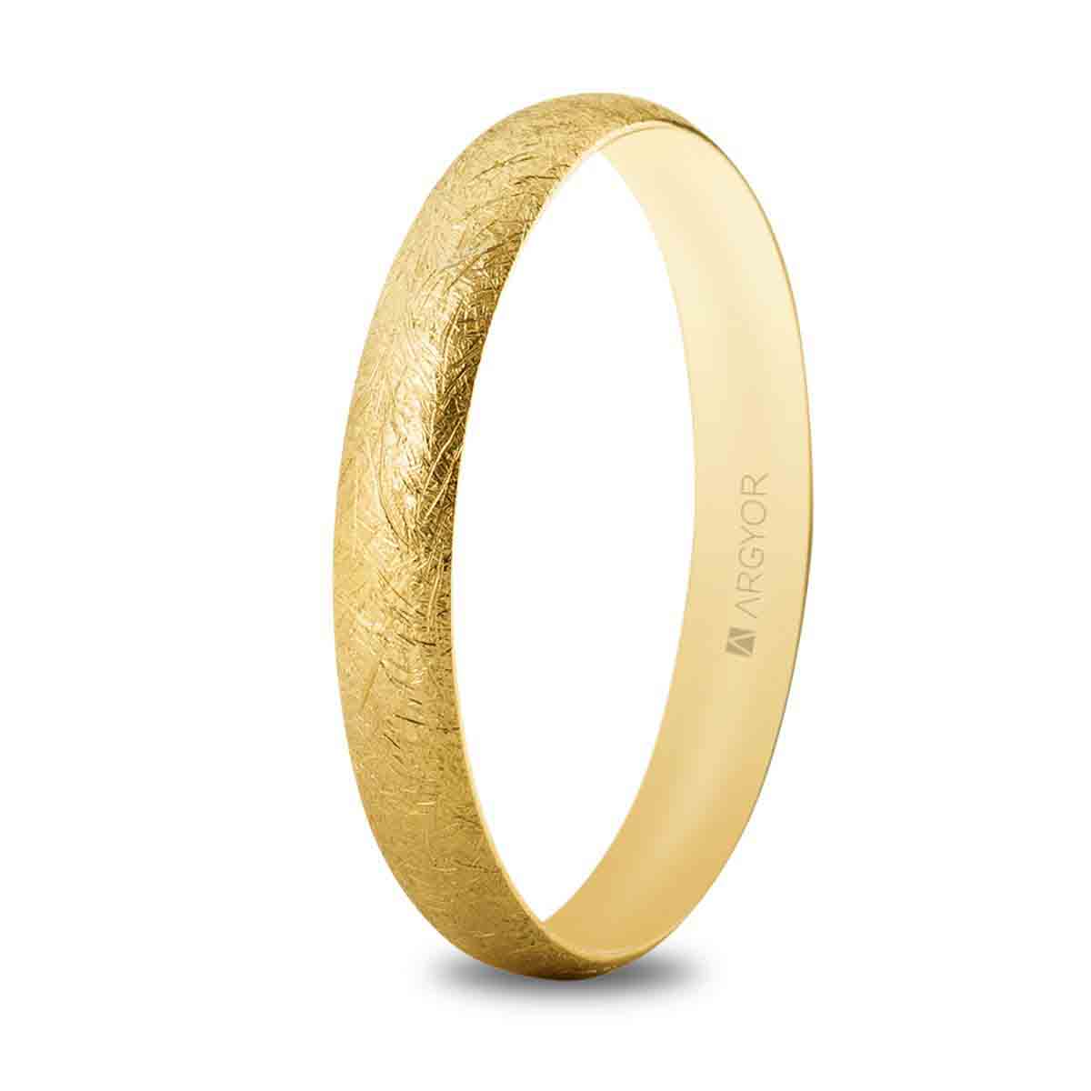 Alianza de boda clásica media caña de oro amarillo de 18K modelo 5135513H de 3.3 mm de ancho. Acabado efecto hielo, interior confort y extrabombeada. A esta alianza se le puede añadir un diamante en talla brillante de 0.03ct color H y pureza SI.