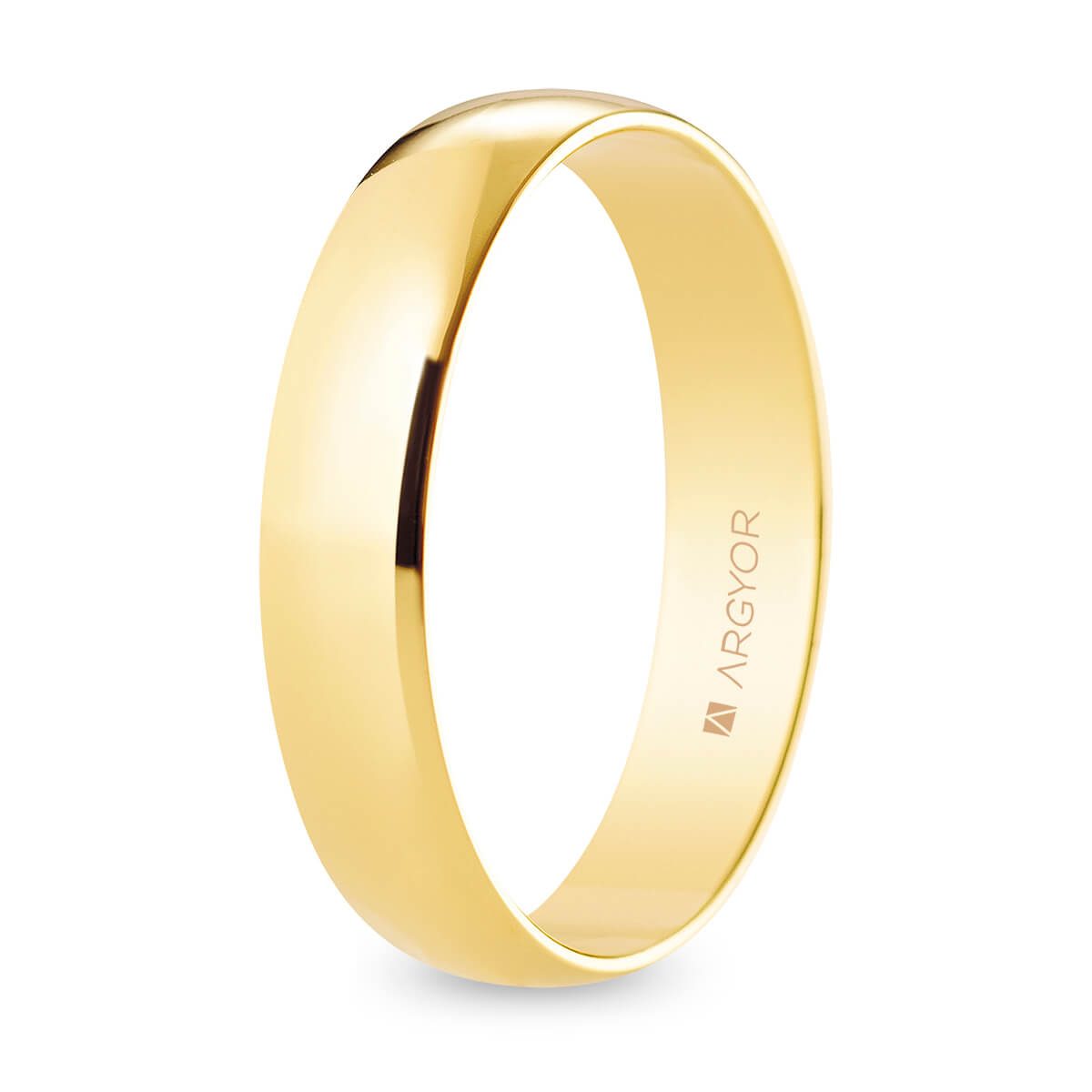 Alianza de boda. Forma media caña. Anchura 4,5mm interior plano. Fabricada en oro amarillo de 18k con acabado pulido. Modelo A45RP00