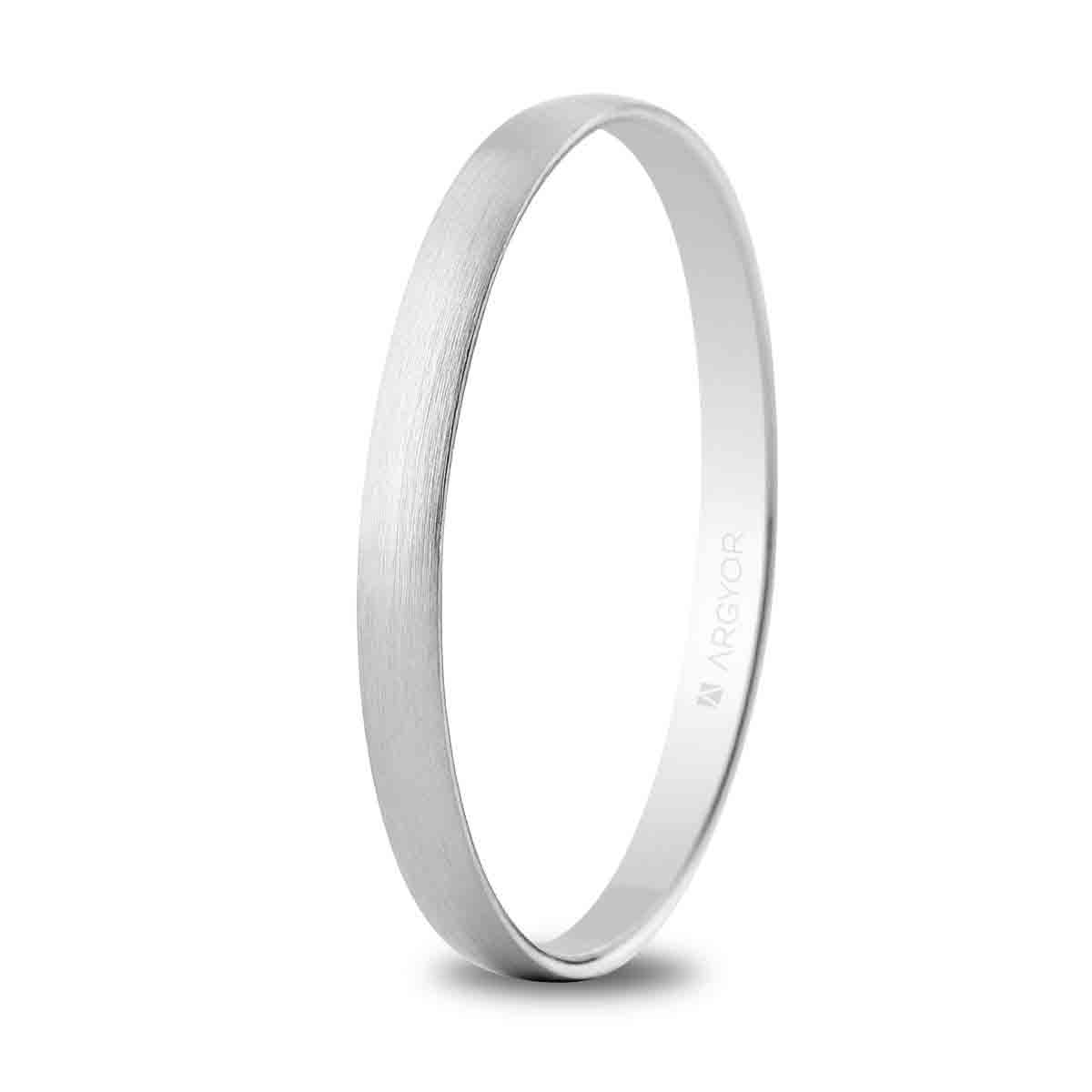 Preciosa alianza de oro blanco incluyendo nuestro efecto satinado en uno de nuestros diseños más finos de media caña. Gracias a la delicadeza de nuestro cepillado scotch, llevado a cabo manualmente sobre cada una de nuestras alianzas satinadas, se consiguen estas suaves líneas verticales. Una excelente opción si queréis huir del pulido habitual pero preferís un acabado que se mantenga discreto. Anchura: 2 milímetros. Interior plano. Referencia: 5B201S.