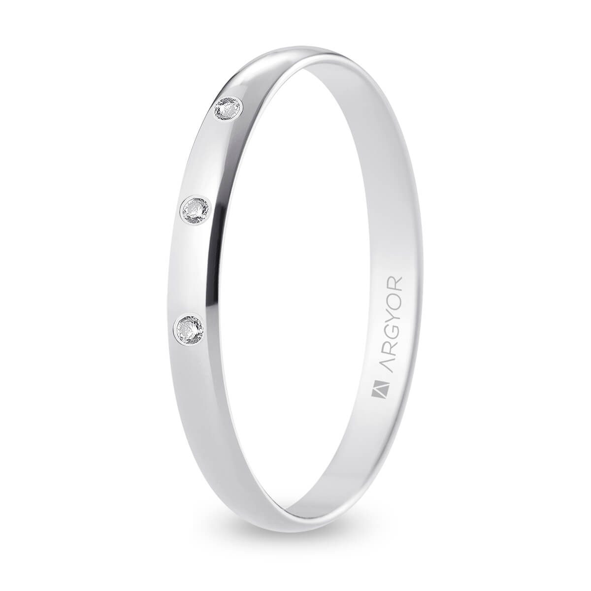 Alianza de boda. Forma media caña. Anchura 2,5 mm interior plano. Fabricada en oro blanco de 18k con acabado pulido. Engastada con 3 diamantes total 0.03ct talla brillante color H, pureza SI. Modelo B25RP3D