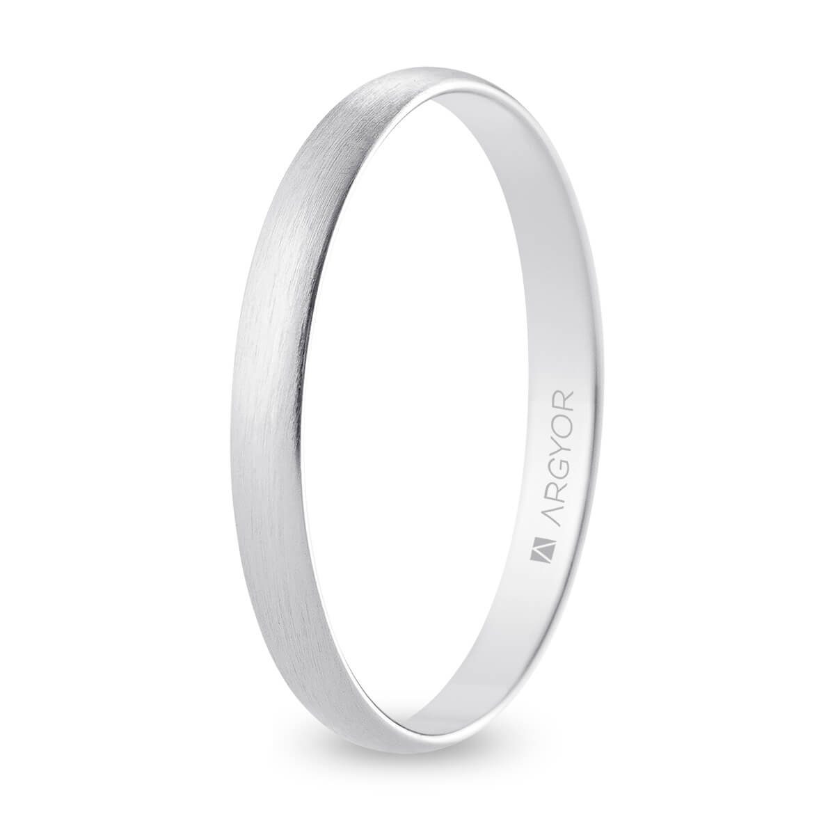Alianza de boda. Forma media caña. Anchura 2,5 mm interior plano. Fabricada en oro blanco de 18k con acabado satinado. Modelo B25RS00