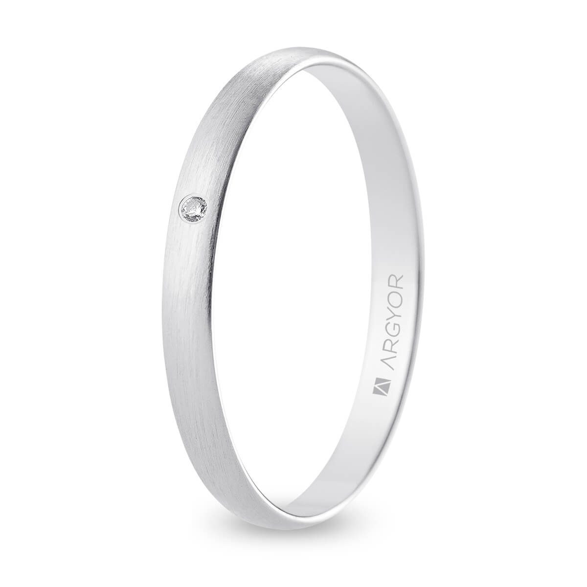 Alianza de boda. Forma media caña. Anchura 2,5 mm interior plano. Fabricada en oro blanco de 18k con acabado satinado.Engastada con 1 diamante 0.01ct talla brillante color H, pureza SI. Modelo B25RS1D