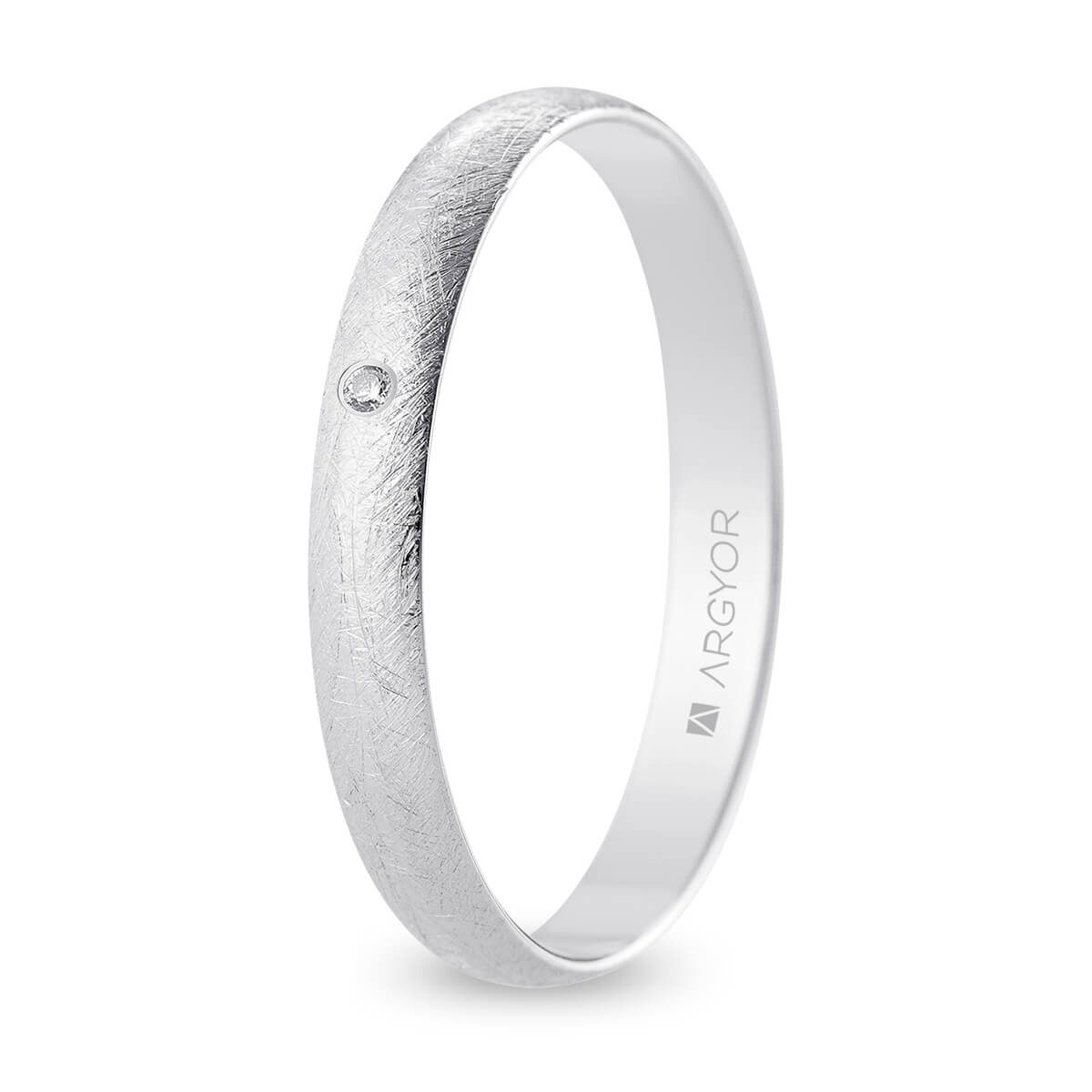 Alianza de boda. Forma media caña. Anchura 3 mm interior plano. Fabricada en oro blanco de 18k con acabado hielo.Engastada con 1 diamante 0.01ct talla brillante color H, pureza SI. Modelo B30RH1D