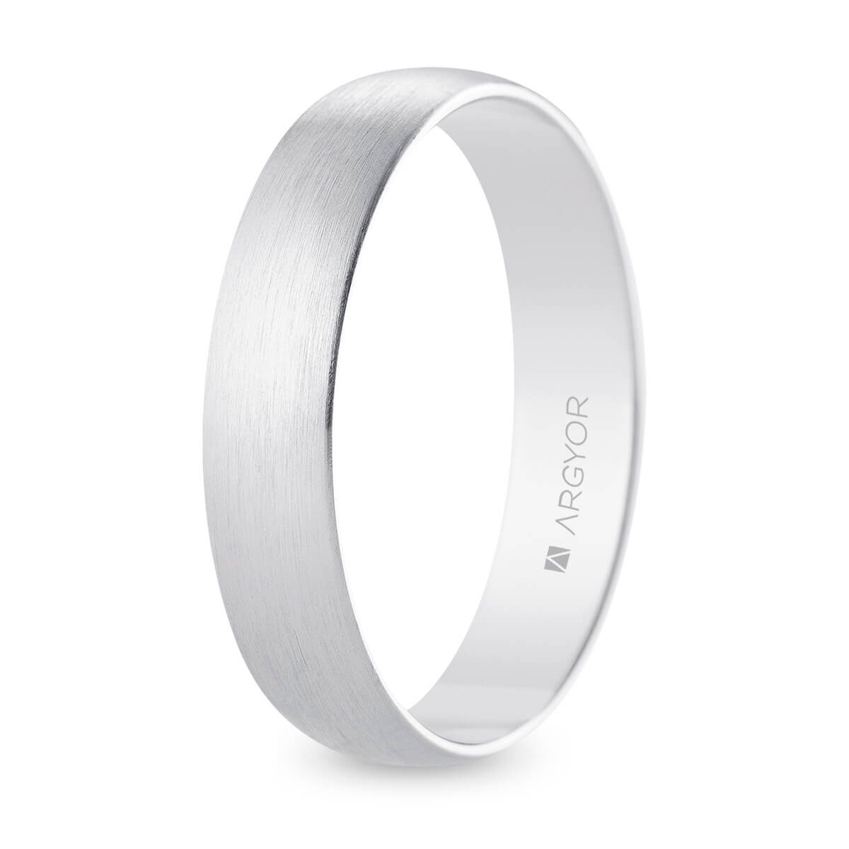 Alianza de boda. Forma media caña. Anchura 4,5 mm interior plano. Fabricada en oro blanco de 18k con acabado satinado. Modelo B45RS00