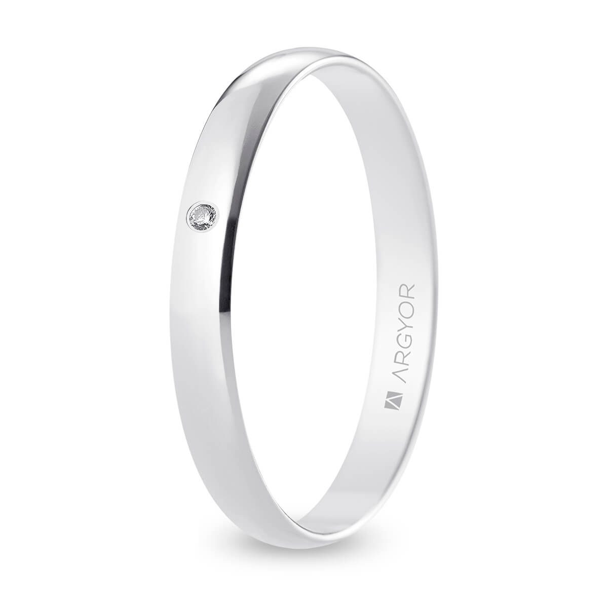 Alianza de boda. Forma media caña. Anchura 3 mm interior plano. Fabricada en oro blanco de 9k con acabado pulido. Engastada con 1 diamante 0.01 ct talla brillante color H, pureza SI. Modelo B30RP1D