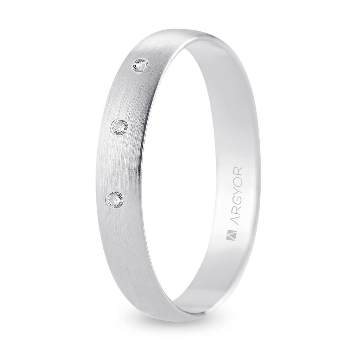 Alianza de boda. Forma media caña. Anchura 3 mm interior plano. Fabricada en oro blanco de 9k con acabado satinado. Engastada con 3 diamantes total 0.03 ct talla brillante color H, pureza SI. Modelo B30RS3D