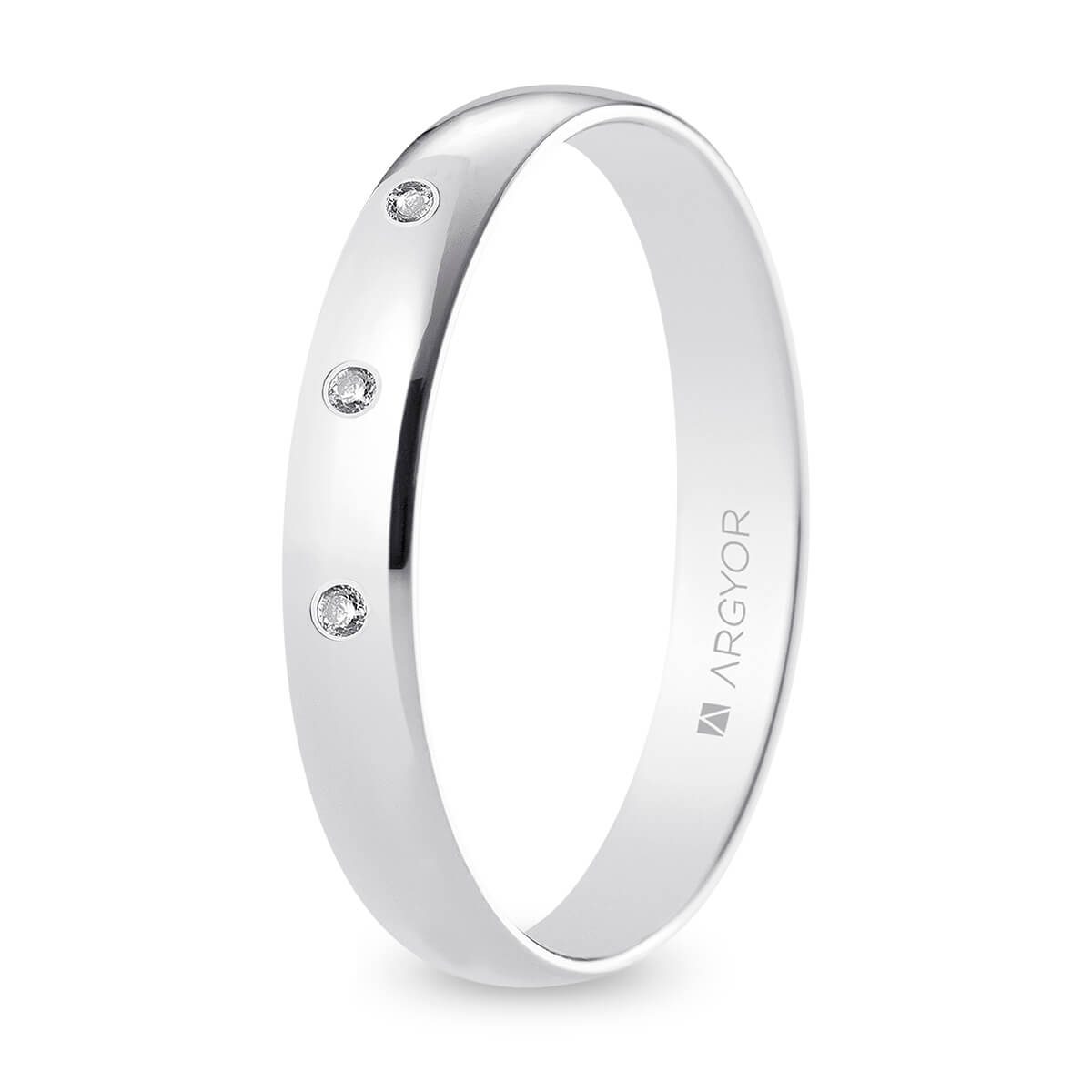 Alianza de boda. Forma media caña. Anchura 3,5 mm interior plano. Fabricada en oro blanco de 9k con acabado pulido. Engastada con 3 diamantes total 0.03 ct talla brillante color H, pureza SI. Modelo B35RP3D.
