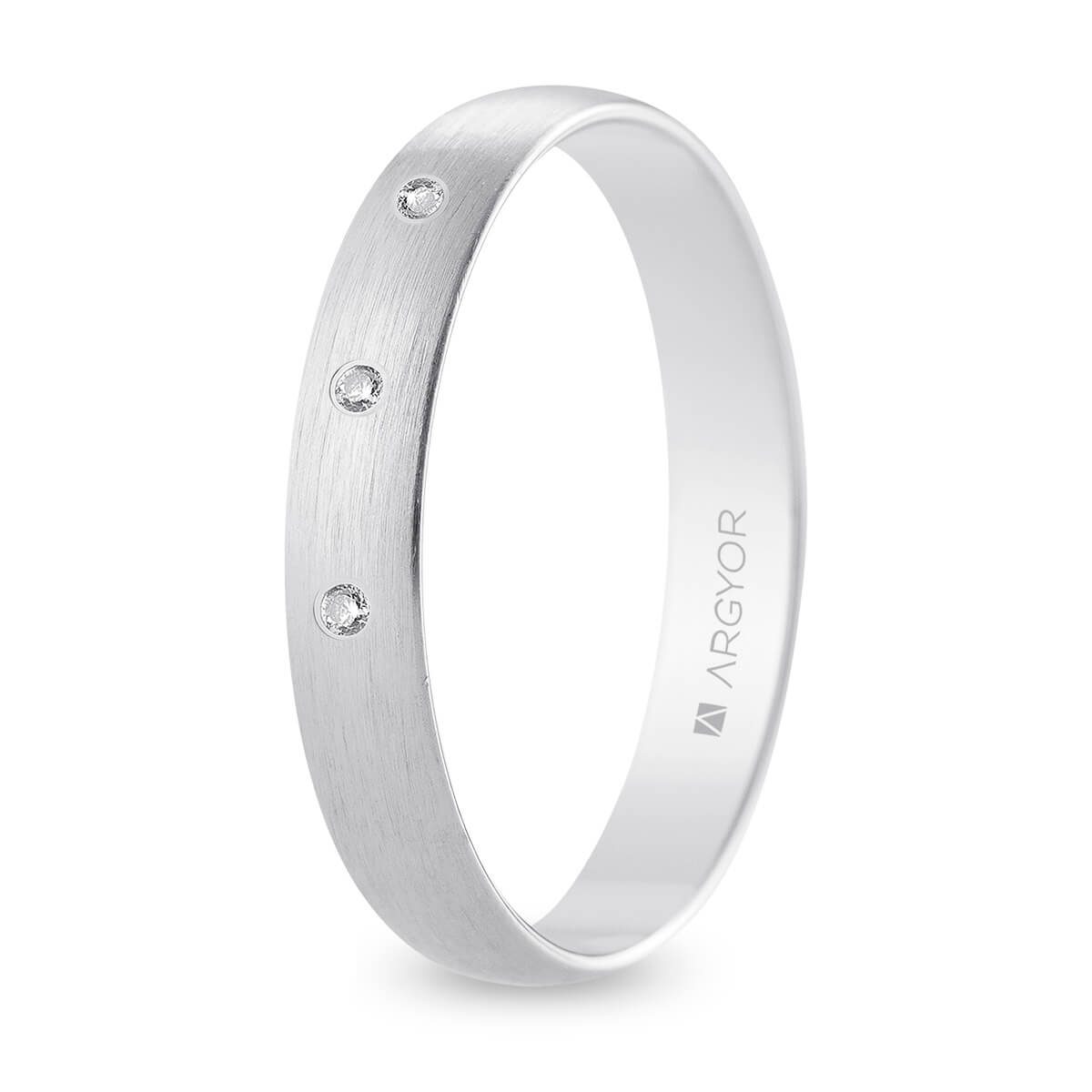 Alianza de boda. Forma media caña. Anchura 3,5 mm interior plano. Fabricada en oro blanco de 9k con acabado satinado. Engastada con 3 diamantes total 0.03 ct talla brillante color H, pureza SI. Modelo B35RS3D.