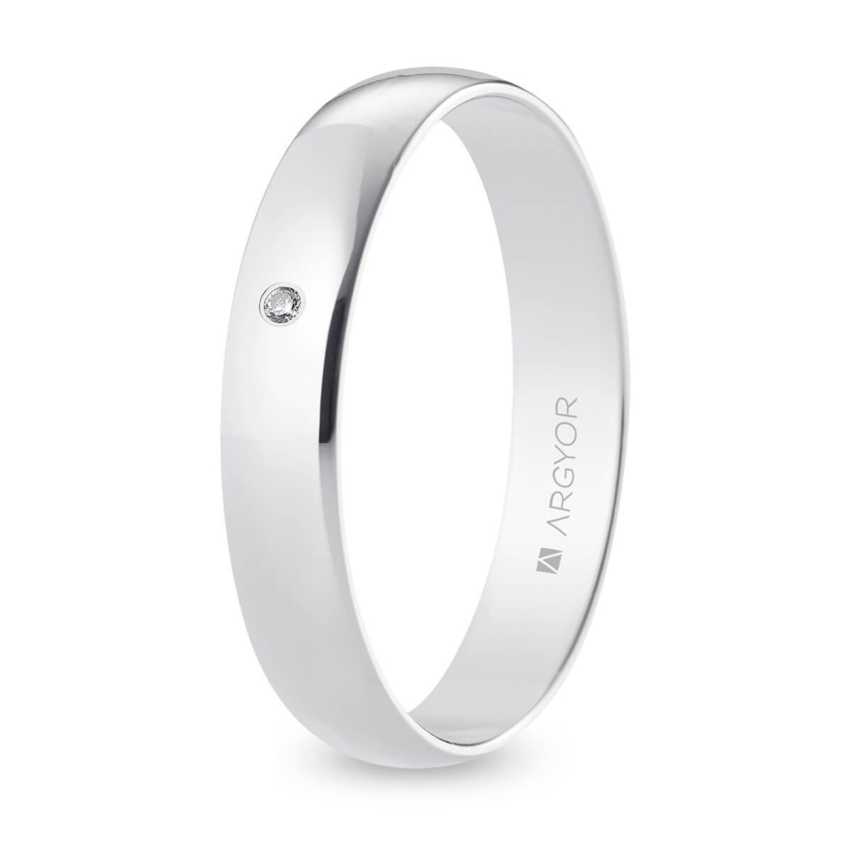 Alianza de boda. Forma media caña. Anchura 4 mm interior plano. Fabricada en oro blanco de 9k con acabado pulido. Engastada con 1 diamante 0.01 ct talla brillante color H, pureza SI. Modelo B40RP1D.