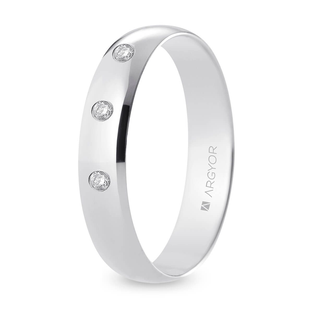 Alianza de boda. Forma media caña. Anchura 4,5 mm interior confort. Fabricada en oro blanco de 9k con acabado pulido. Engastada con 3 diamantes 0.06 ct talla brillante color H, pureza SI. Para mayor confort el interior está ligeramente bombeado. Modelo B45CP3D.