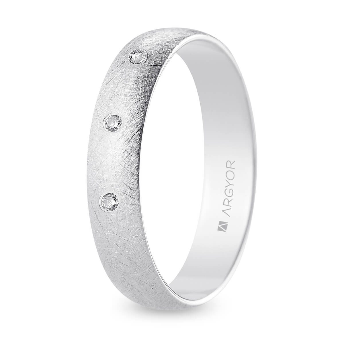 Alianza de boda. Forma media caña. Anchura 4,5 mm interior plano. Fabricada en oro blanco de 9k con acabado hielo.Engastada con 3 diamantes total 0.045 ct talla brillante color H, pureza SI. Modelo B45RH3D.