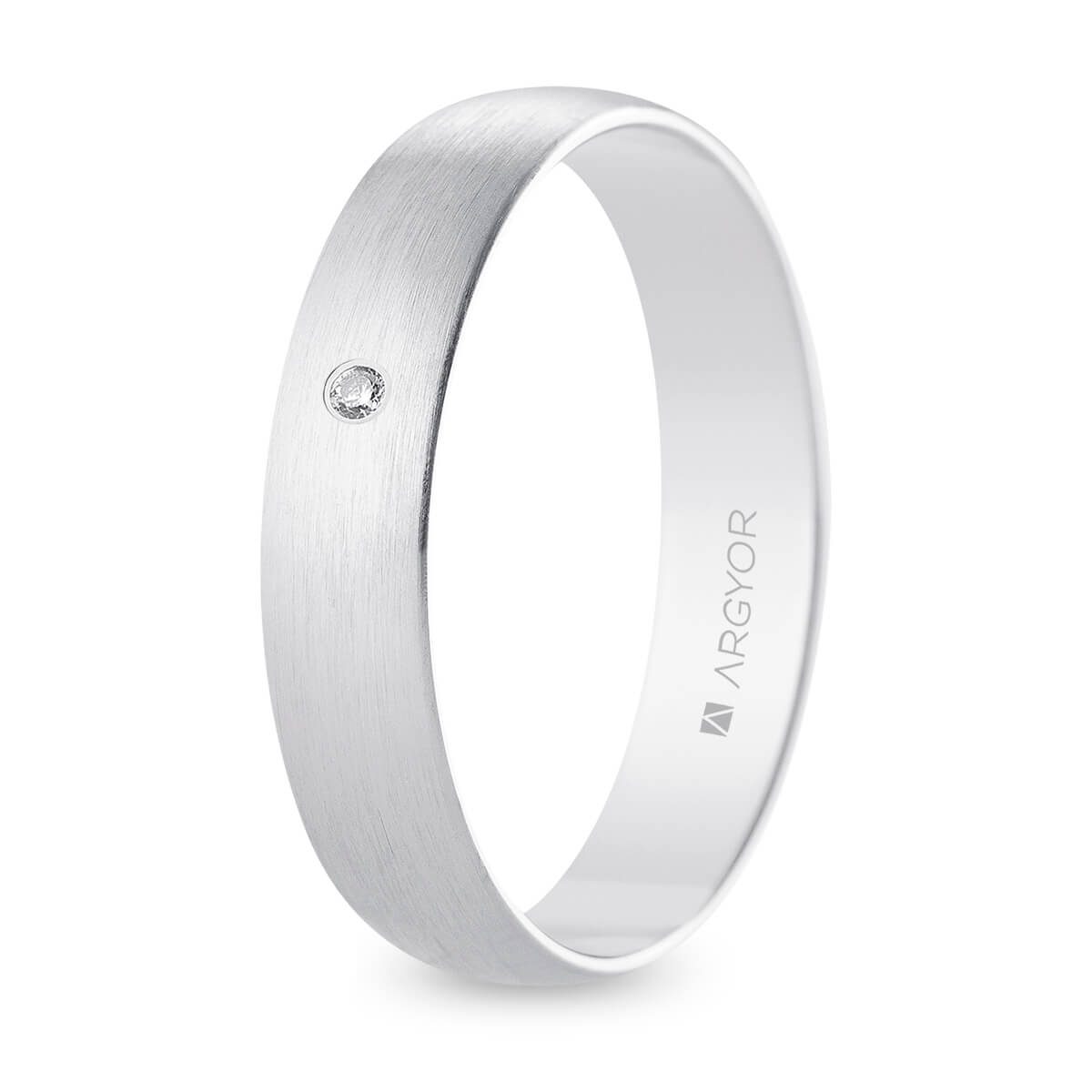 Alianza de boda. Forma media caña. Anchura 4,5 mm interior plano. Fabricada en oro blanco de 9k con acabado satinado. Engastada con 1 diamante 0.015 ct talla brillante color H, pureza SI. Modelo B45RS1D.