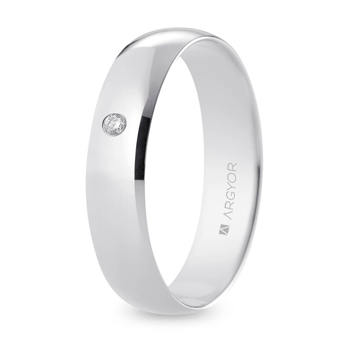 Alianza de boda. Forma media caña. Anchura 5 mm interior confort. Fabricada en oro blanco de 9k con acabado pulido. Engastada con 1 diamante 0.02 ct talla brillante color H, pureza SI. Para mayor confort el interior está ligeramente bombeado. Modelo B50CP1D.