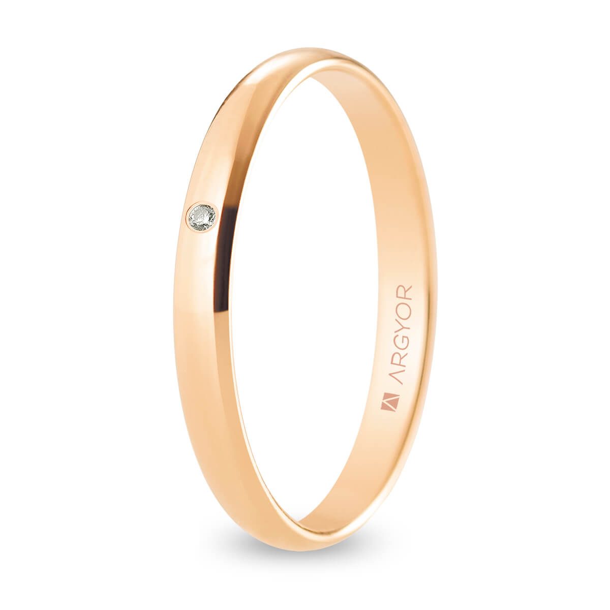 Alianza de boda. Forma media caña. Anchura 2,5 mm interior confort. Fabricada en oro rosa de 18k con acabado pulido. Engastada con 1 diamante 0.01 ct talla brillante color H, pureza SI. Para mayor confort el interior está ligeramente bombeado. Modelo R25CP1D.