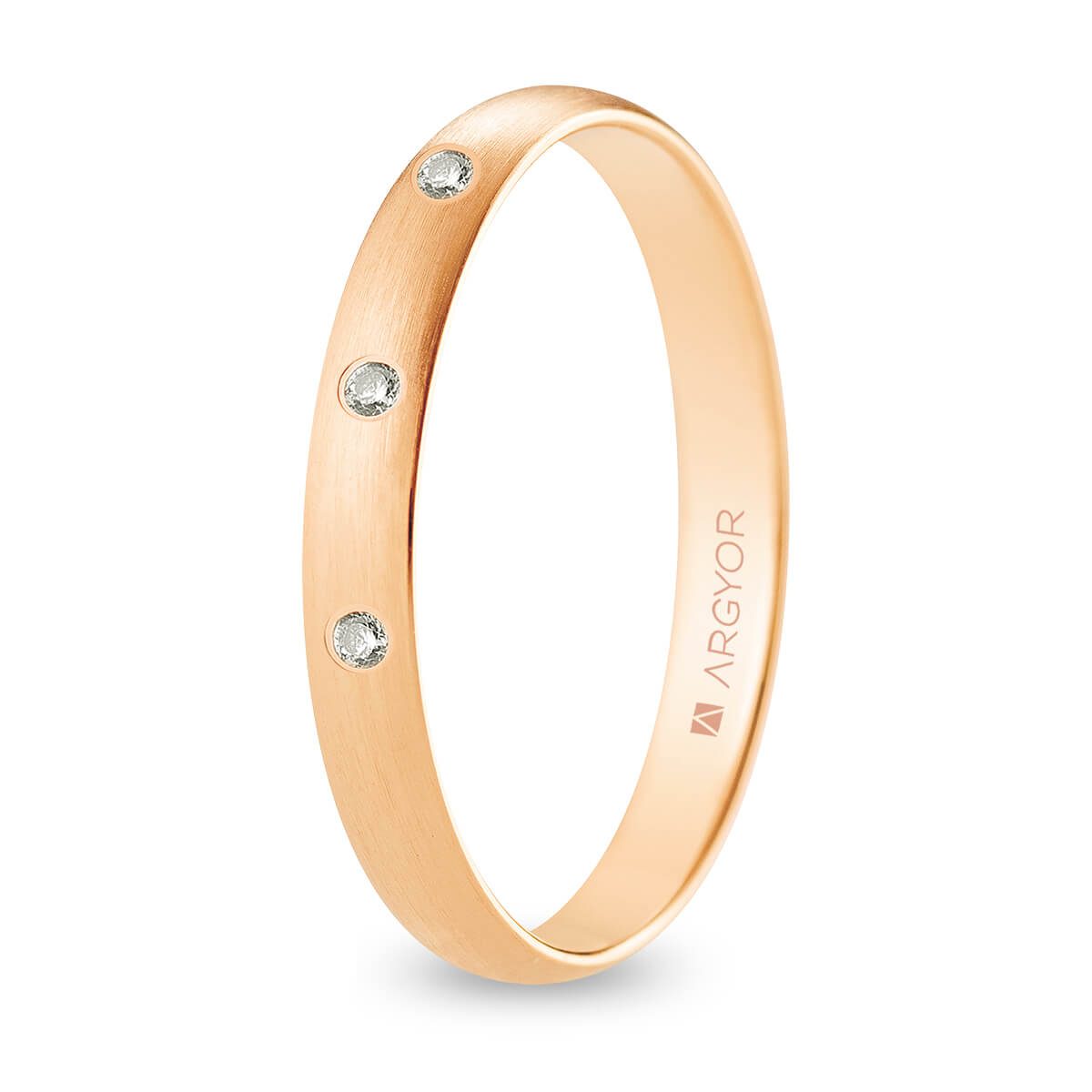 Alianza de boda. Forma media caña. Anchura 3 mm interior confort. Fabricada en oro rosa de 18k con acabado satinado. Engastada con 3 diamantes total 0.045 ct talla brillante color H, pureza SI. Para mayor confort el interior está ligeramente bombeado. Modelo R30CS3D.