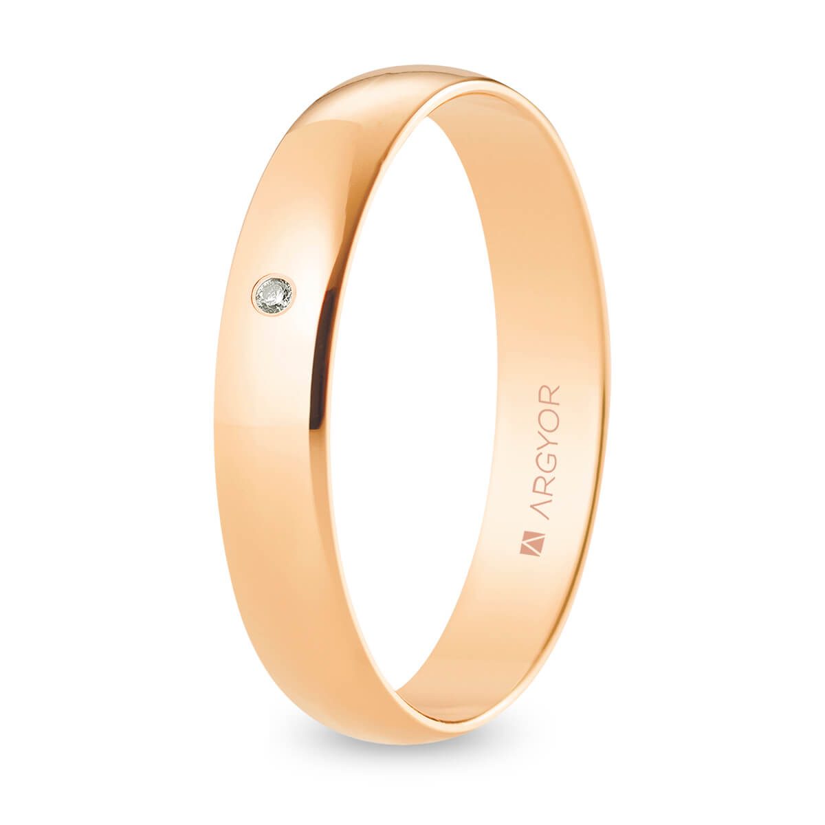 Alianza de boda. Forma media caña. Anchura 4 mm interior plano. Fabricada en oro rosa de 18k con acabado pulido. Engastada con 1 diamante 0.01 ct talla brillante color H, pureza SI. Modelo R40RP1D.
