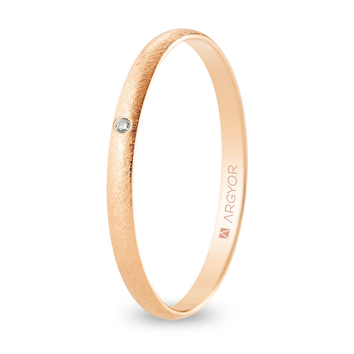 Alianza de boda. Forma media caña. Anchura 2 mm interior plano. Fabricada en oro rosa de 18k con acabado hielo. Engastada con 1 diamante 0.01 ct talla brillante color H, pureza SI. Modelo R20RH1D.